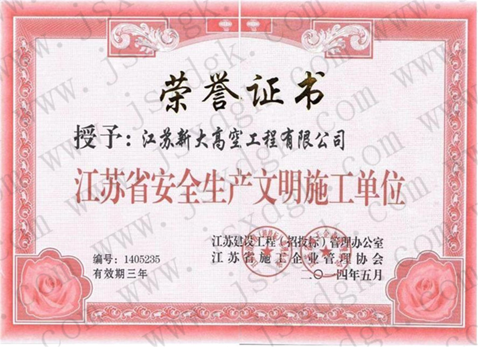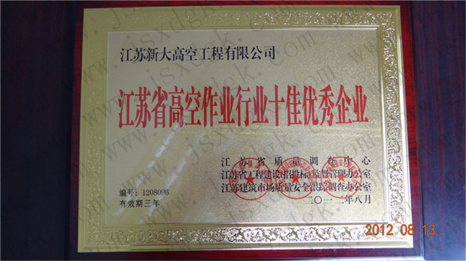 江蘇省高空行業五十強行業證書